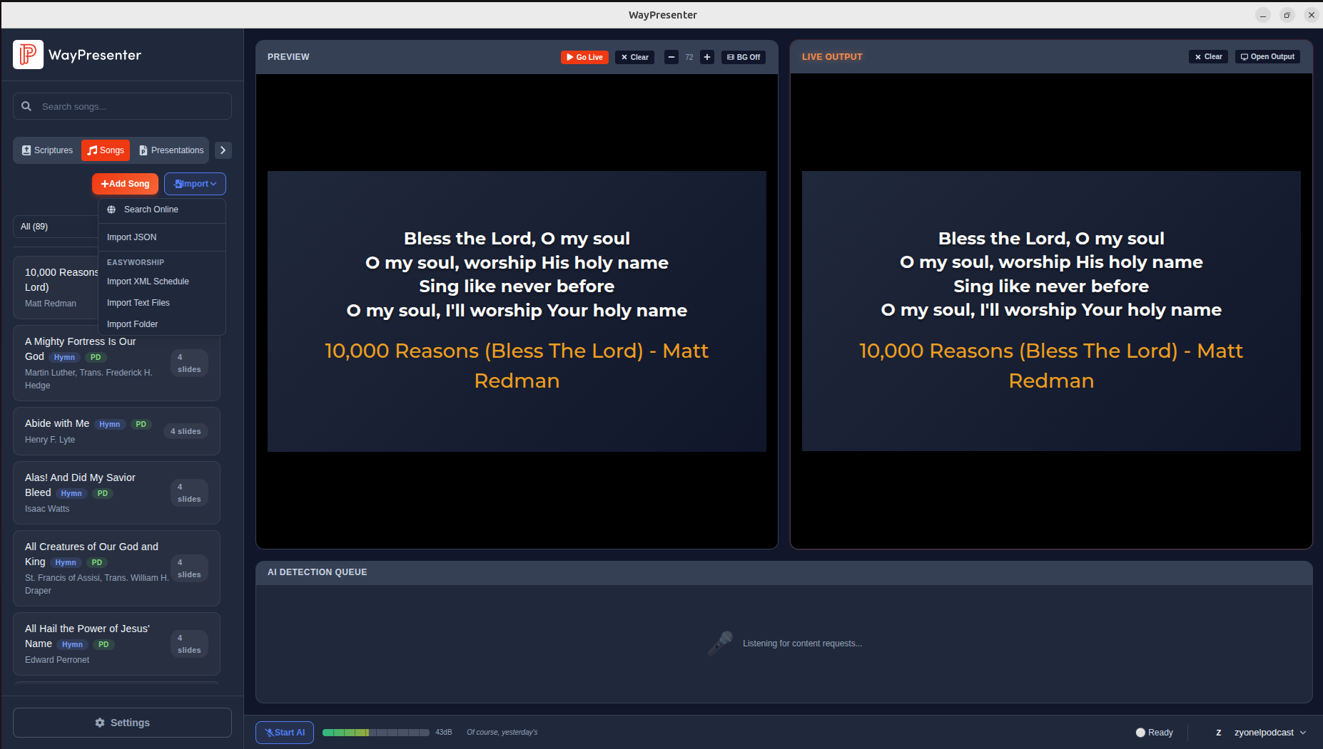 .txt,.docx, or.pptxfiles - WayPresenter will parse the lyrics and detect sections automatically
